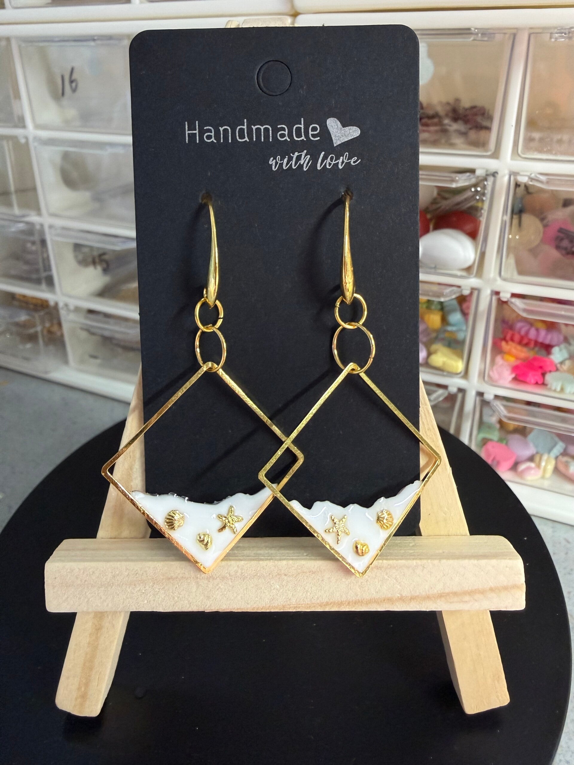 Witte Epoxy oorbellen met kleine goudkleurige schelpdetails.